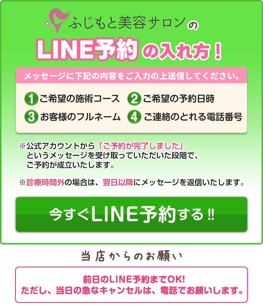 ふじもと美容サロンのご予約・お問い合わせは、お電話またはLINEのお好きな方法をお選びいただけますが、できる限りお電話でのご予約が確実です。